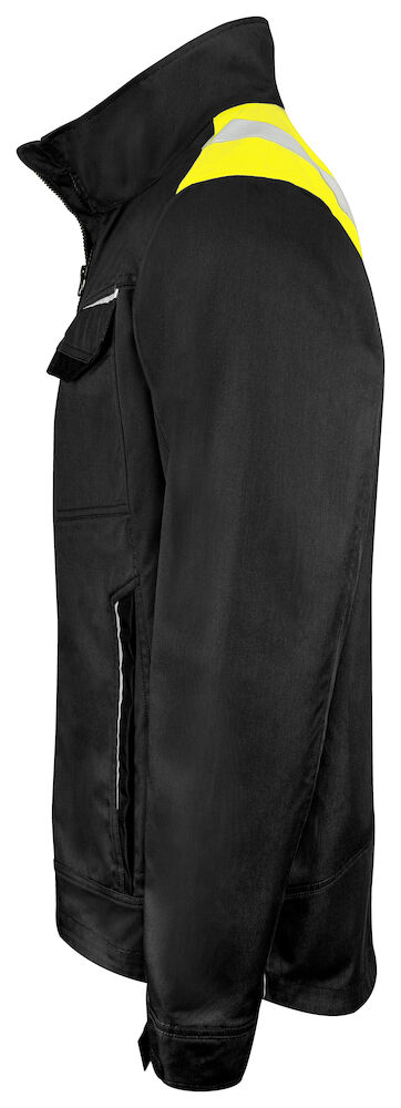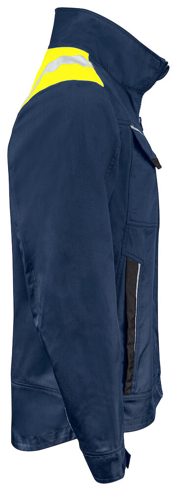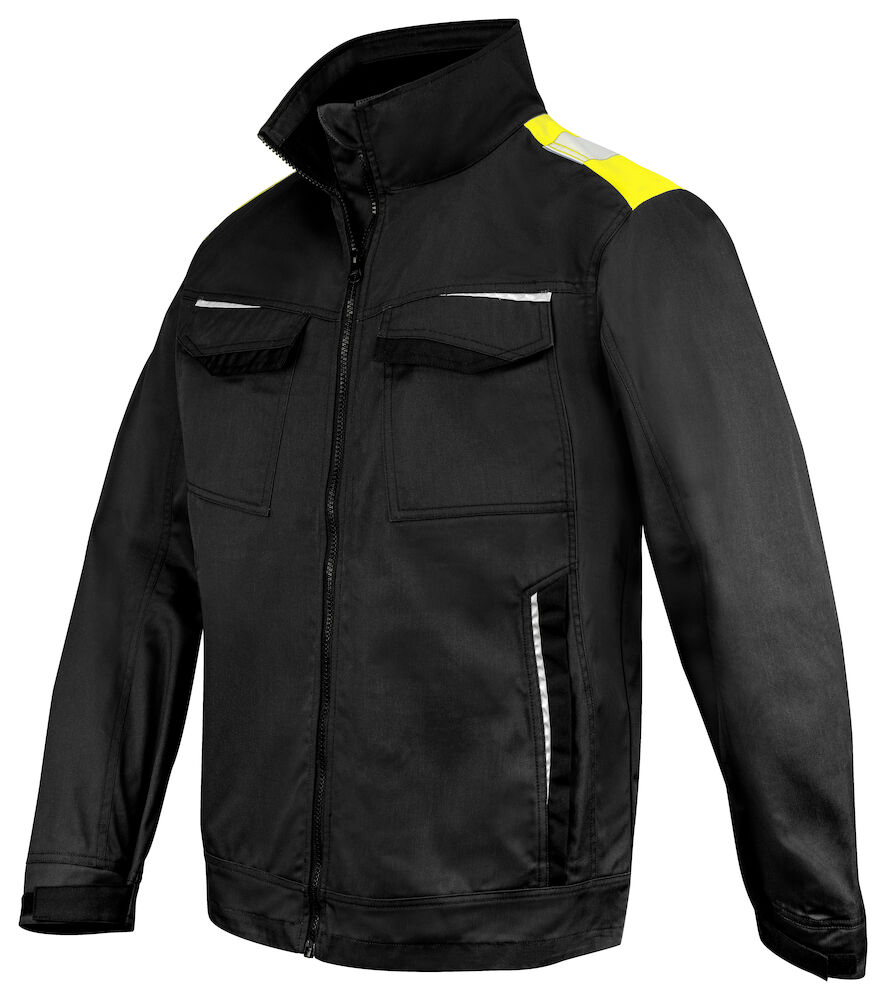 Servicejakke med glidelås opp i kragen i front, med innvendig vindklaff for å hindre trekk, samt hakebeskyttelse for å forhindre gnagsår. Fleecefôr i kragen gir god komfort. Brystlommer, i venstre brystlomme er det et indre feste for ID-kort. Sidelommer med glidelås. Romslige innerlommer, også en innvendig telefonlomme som lukkes med borrelås. Forlenget i ryggen. Justerbare mansjetter med borrelås. Reflekspiping i nederkant bak og på frontlommene for økt synlighet. Fôret kan åpnes for å forenkle trykk og brodering.