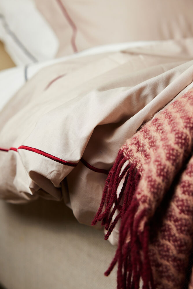 La hotellfølelsen flytte hjem. Carl putetrekk er herlig komfortable. Carl er laget av økologisk percale bomull og bidrar definitivt til en god natts søvn. Percale er en type vevd stoff med en tett veving som holder høy kvalitet og er kjent for sin glatthet og holdbarhet. Trådtetthet 200 per kvadrattomme. Designet er rent og klassisk med en beige/grå base, prydet med burgunderfargede sømmer – en type broderi som kalles "baratta". Tilgjengelig i flere farger. Designstudio Sagaform.