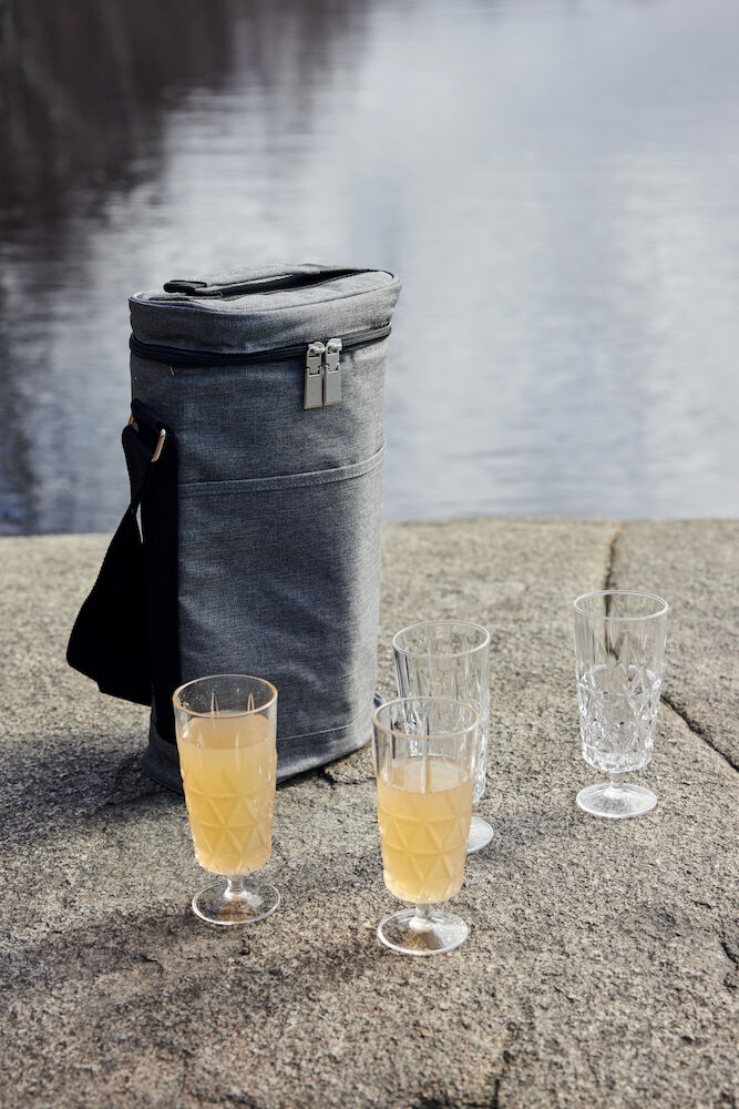 Praktisk og fin kjøleveske med lekre kontrastfargede detaljer. Passer til to vinflasker eller to 1,5 l flasker.Obs! Glidelåsen er gullfarget, ikke svart slik som avbildet. Trykk: Kode 11