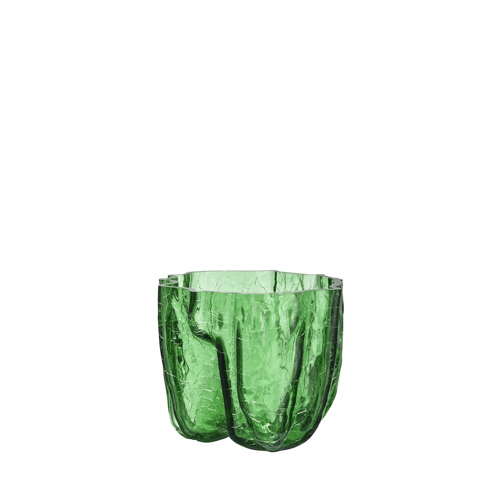 Knatring og torden – et magisk vidunder. Hos Kosta Boda undrer vi oss over vakkert bevarte sprekker i glass. Den grønne vasen fra Crackle-kolleksjonen har et uttrykksfullt, skulpturelt ytre laget med en gammel håndverksteknikk der det varme glasset dyppes i iskaldt vann. Den krakelerte overflaten reflekterer dagslyset og avslører historiene om ild, jord og vann. Vasen er munnblåst i Kosta og designet av Åsa Jungnelius.