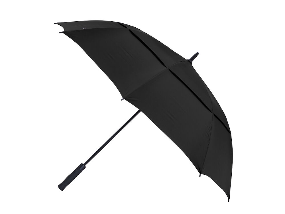 Stor paraply med stålskaft og glassfiberkonstruksjon. Doble lag med stormventil. Automatisk åpning. Mykt rett håndtak i EVA gummi. Lengde: 102 cm, Diameter 130 cm.
