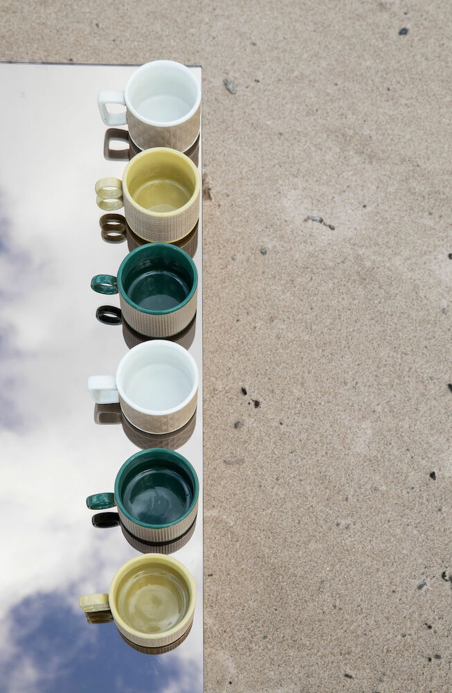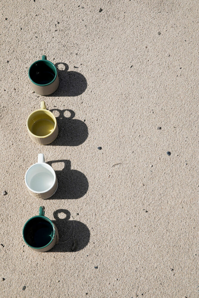 En kaffekopp i retrodesign med tidsriktig preg og doble håndtak. Innvendig i vårens må-ha-farge gul, utvendig i en mønstret beige tone.