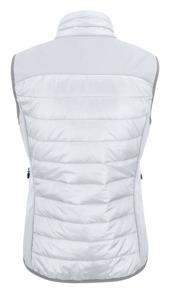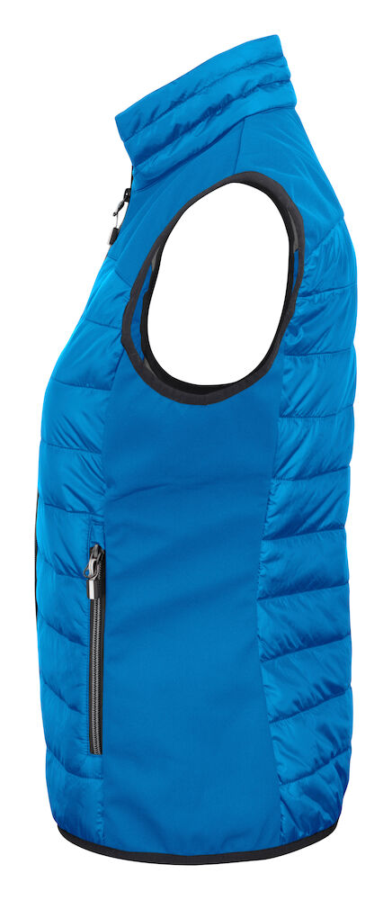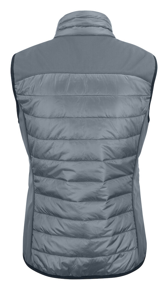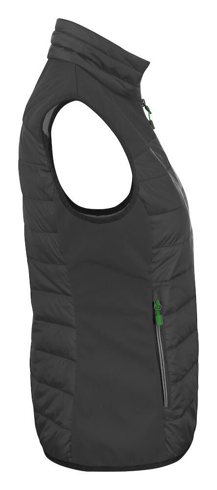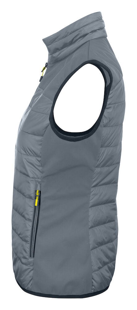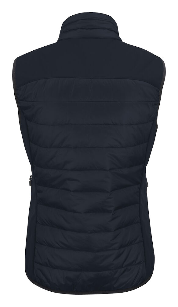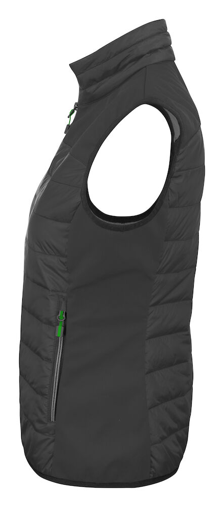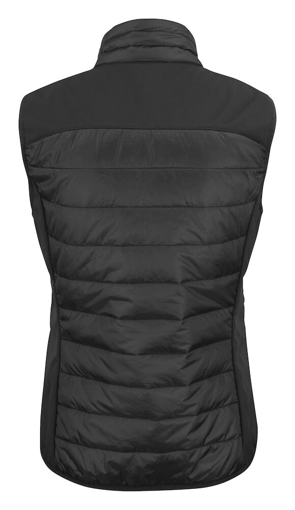 Softshell/lettvattert vest. Sidepanelene og skulderpartiet er av softshellmateriale. Front og bakside har en lett vattering.