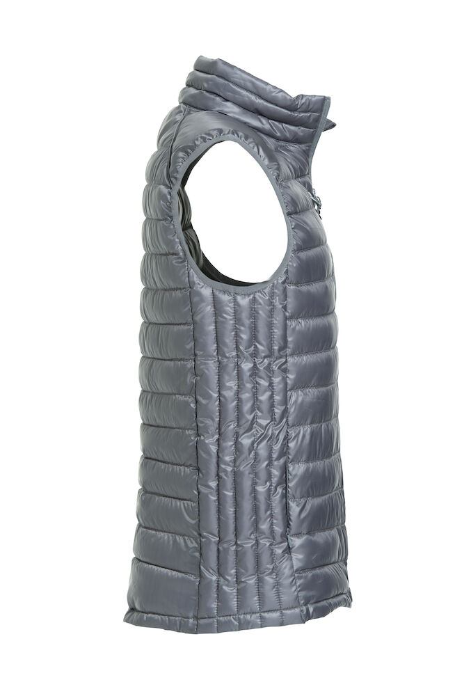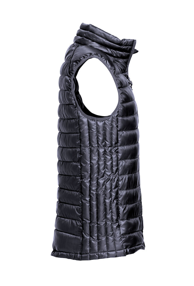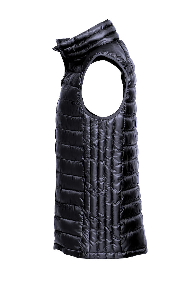 Moderne vest i fuskedun. Tre utvendige lommer med glidelås. To innvendige lommer. Tilpasset for hodetelefoner.