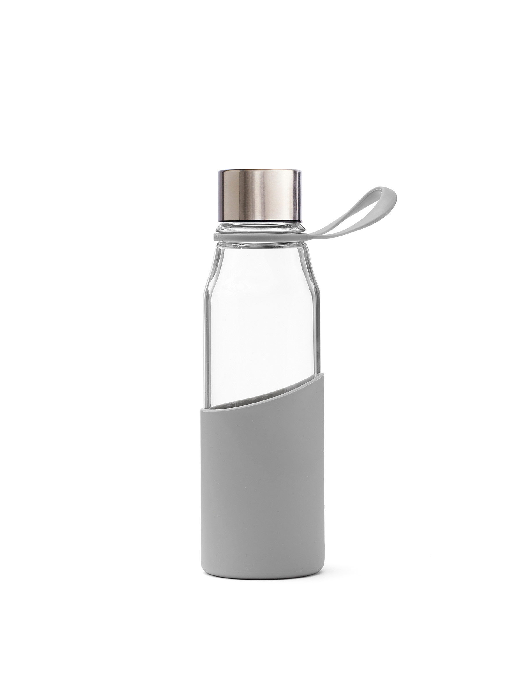 En fin vannflaske i glass som du kan bruke på trening eller kontoret er alltid praktisk å ha. Denne vannflasken er designet i glass og har et godt grep som gjør at det er enkelt å ta den med seg på farten. Glassflasken er i et enkelt, men stilig design i gjennomsiktig glass og grå detaljer. Flasken tåler oppvaskmaskin, holder 550 ml og har et beskyttende lag i silikon.
