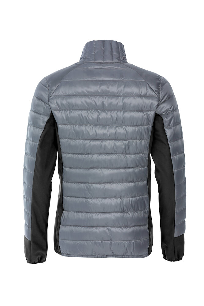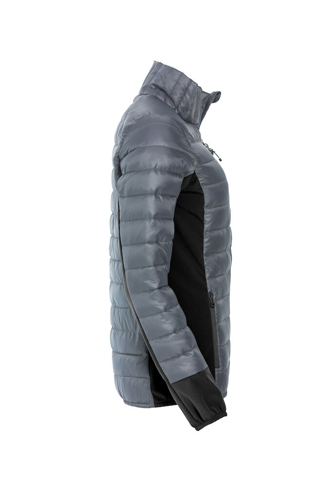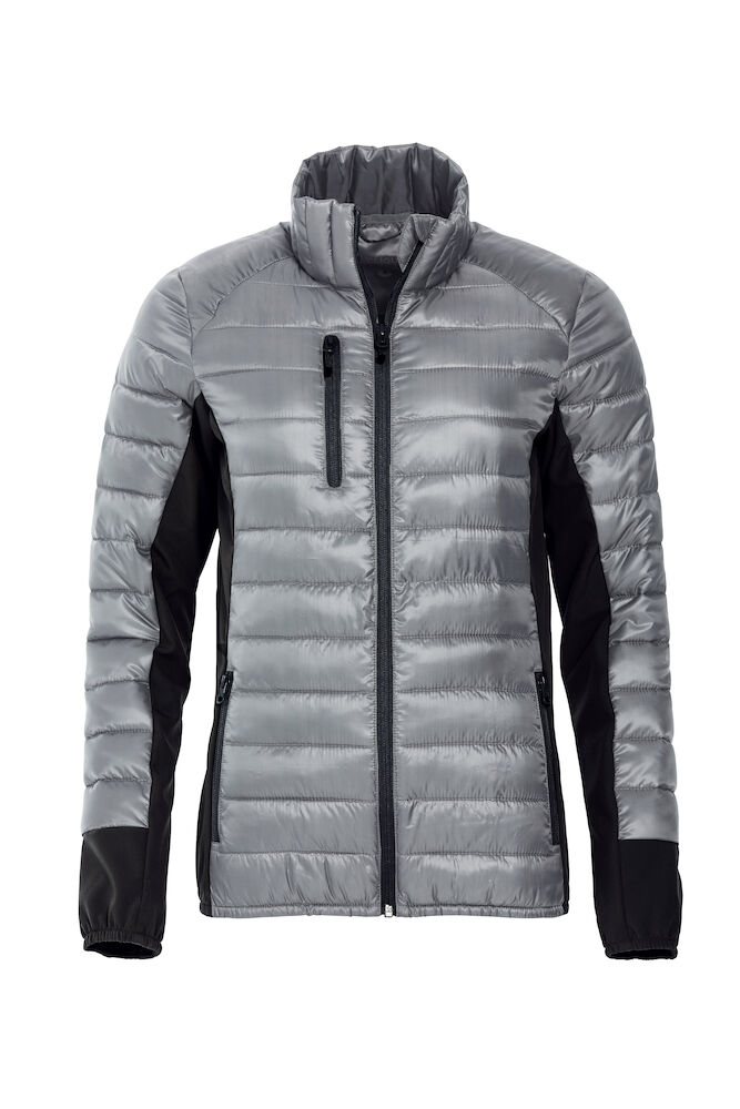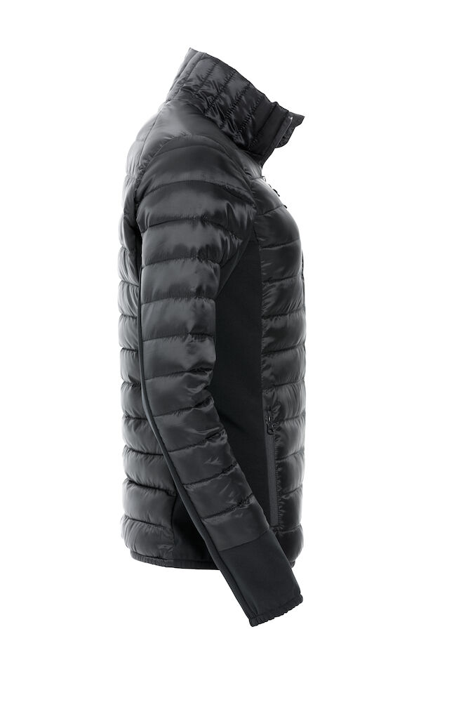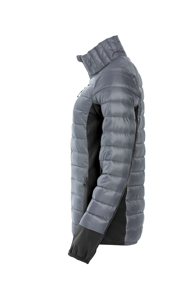 Moderne damejakke i fuskedun med paneler av softshell i siden. Tre utvendige lommer med glidelås. To innvendige lommer. Tilpasset for hodetelefoner.