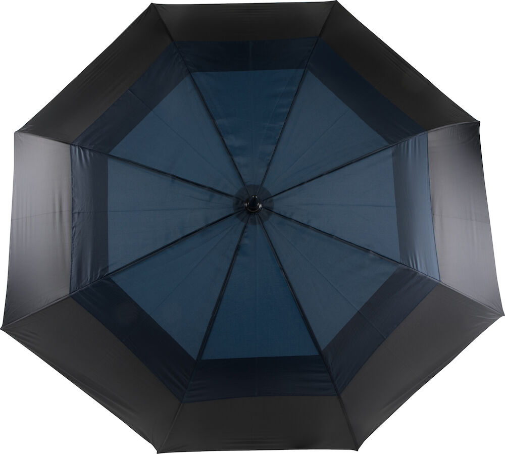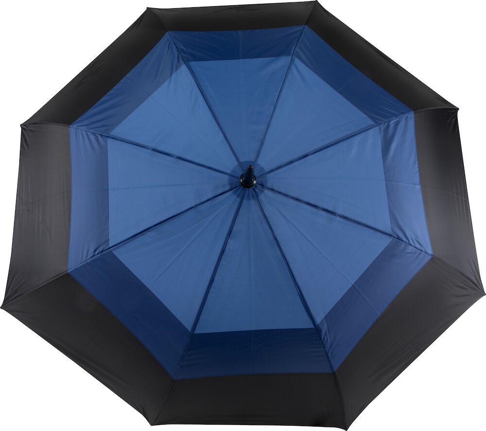 Stormsikker paraply med spiss topp som gjør at man kan feste den i gresset. Glassfiberskaft og dobbel paraplyduk på toppen. Paraplyen har automatisk åpner og er laget av 190t polyester. Størrelse: Skaft: 63,5×1,4 cm. Stoff: 134 cm.