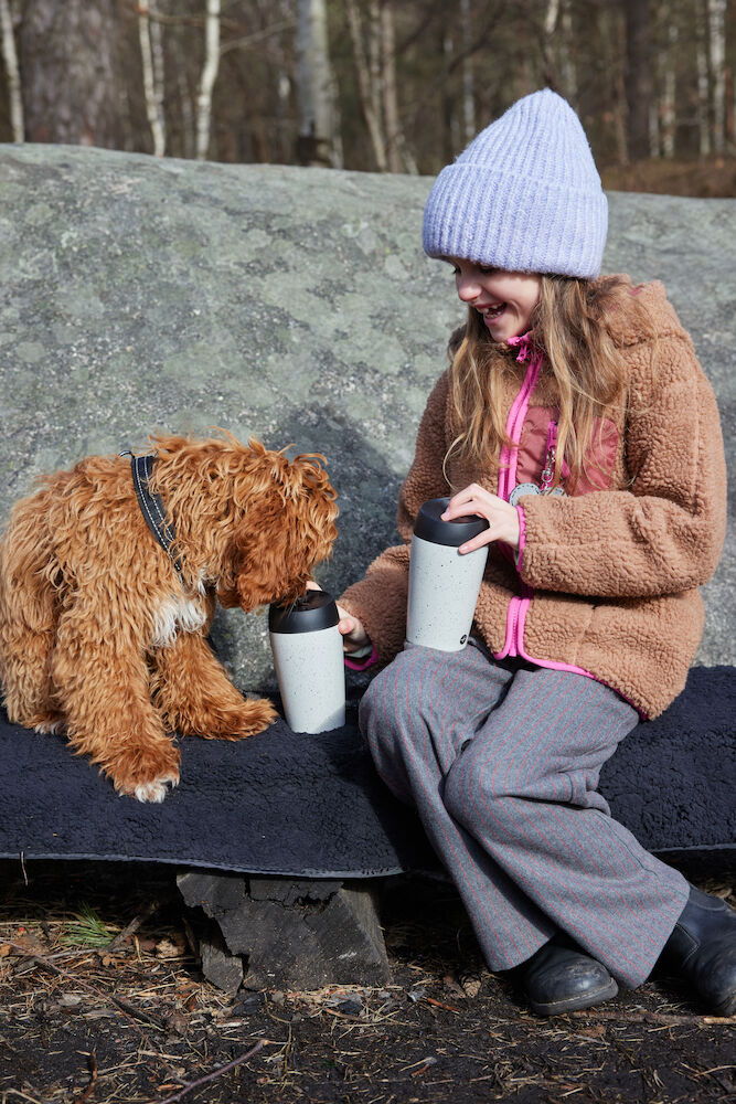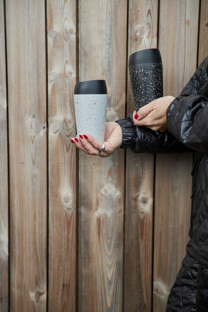 Loke i hvitt med sort sprutmønster, et bilkrus som vi elsker for variasjon, fargevalg og konstruksjon. Loke er en serie produkter som har som formål å forenkle hverdagen. Loke rommer 24 cl og kan enkelt plasseres under kaffemaskinen for påfylling. Kruset har doble vegger for å holde drikken varm lenger. Men det beste av alt er at det ikke er noen lekkasje takket være en smart låsefunksjon.