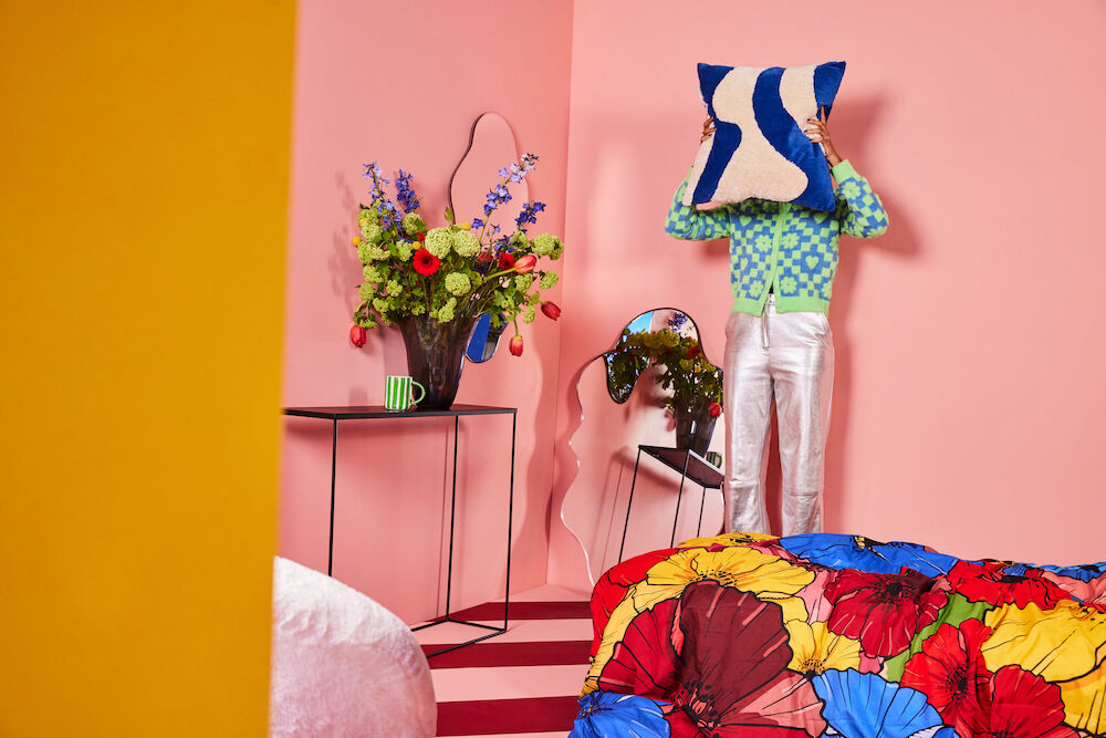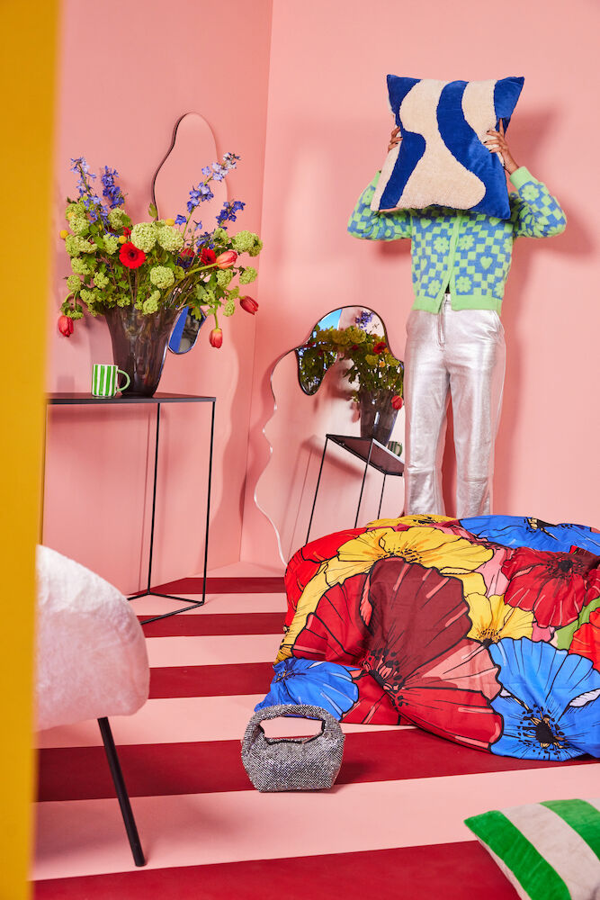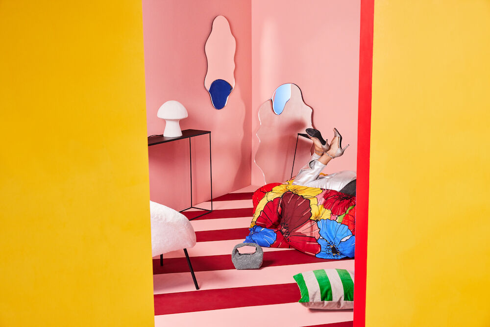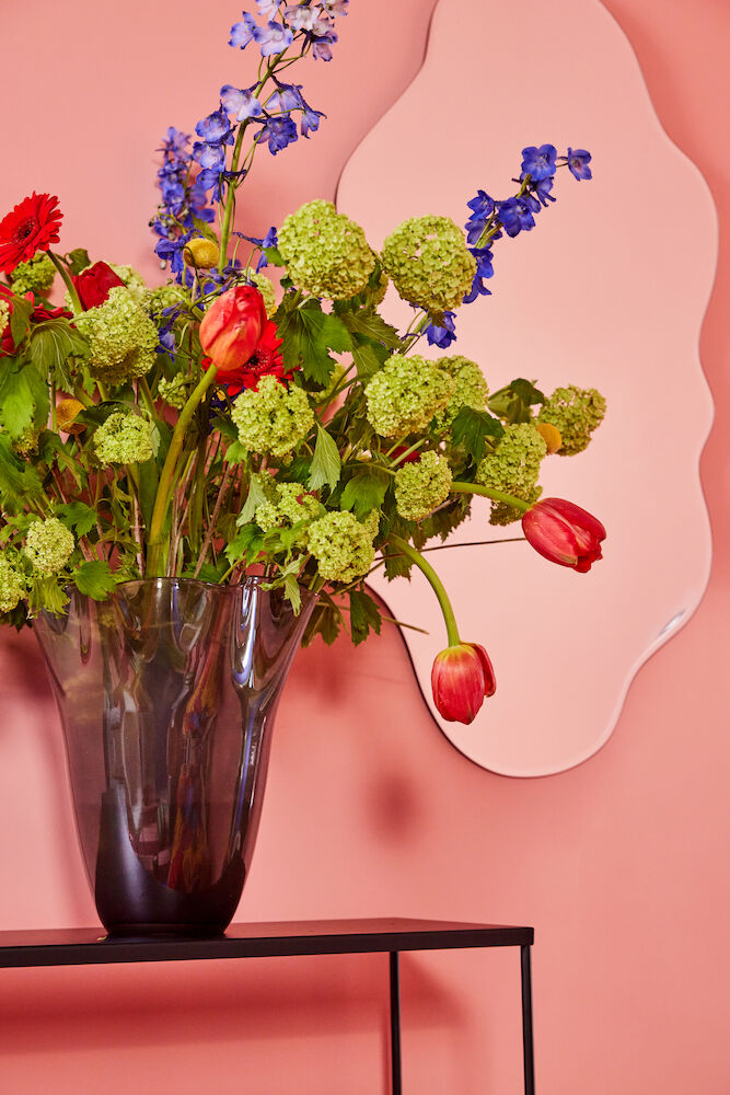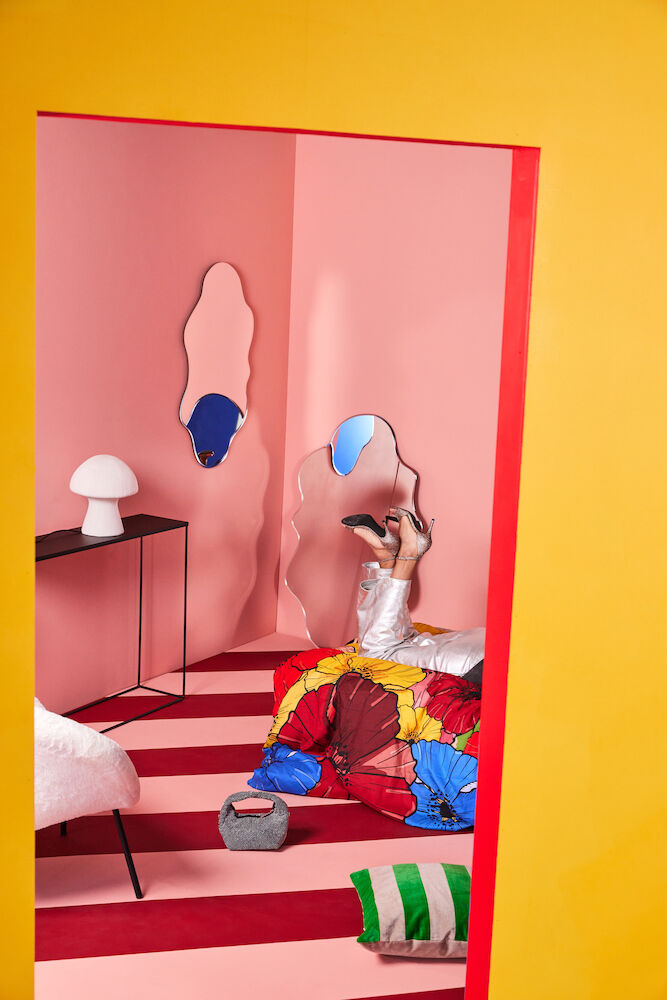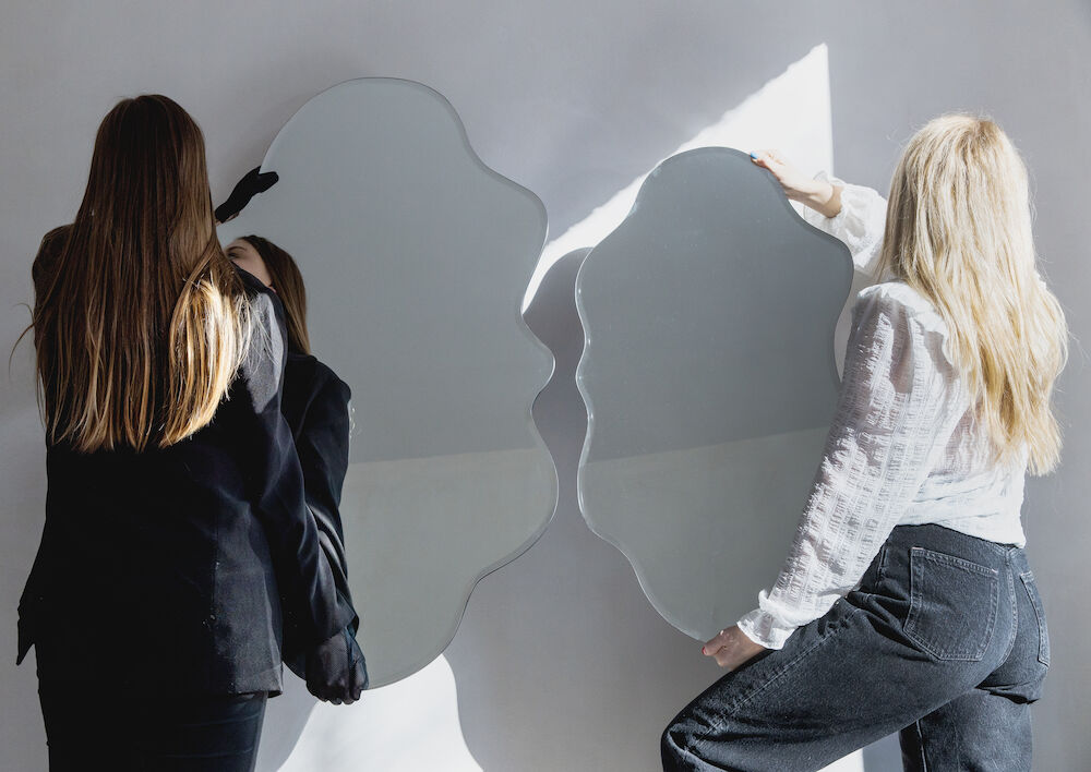 Et fantasifullt speil med organiske former som leker med betrakteren på en forførende måte. Like fin liggende som stående, alene som i par. Speilglass med fasede kanter. Finnes i to størrelser.
