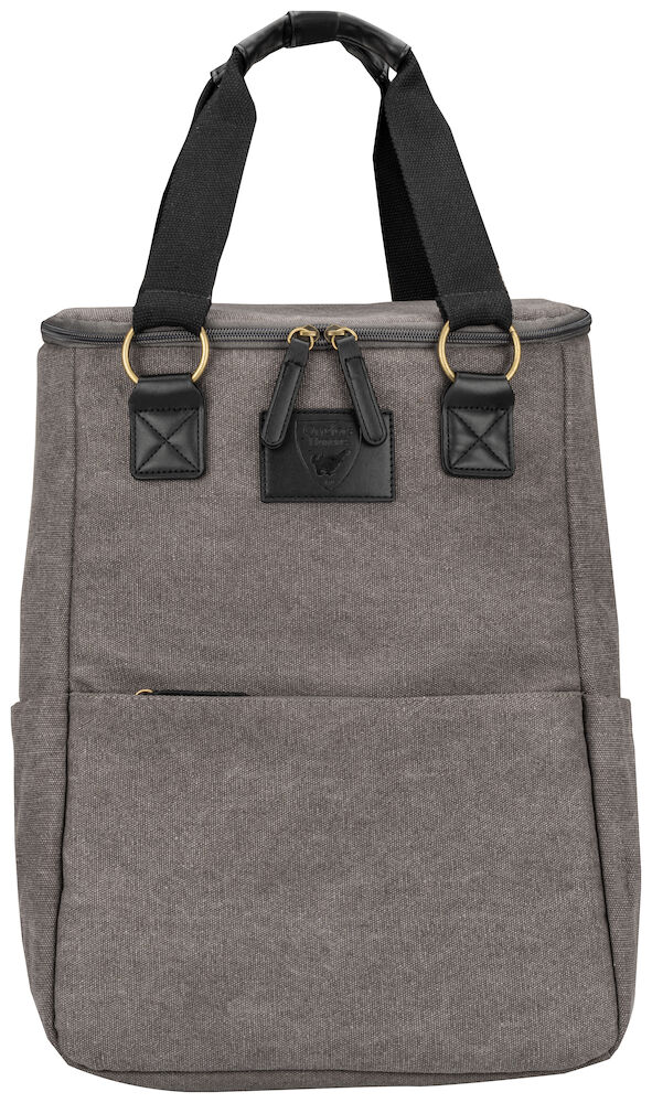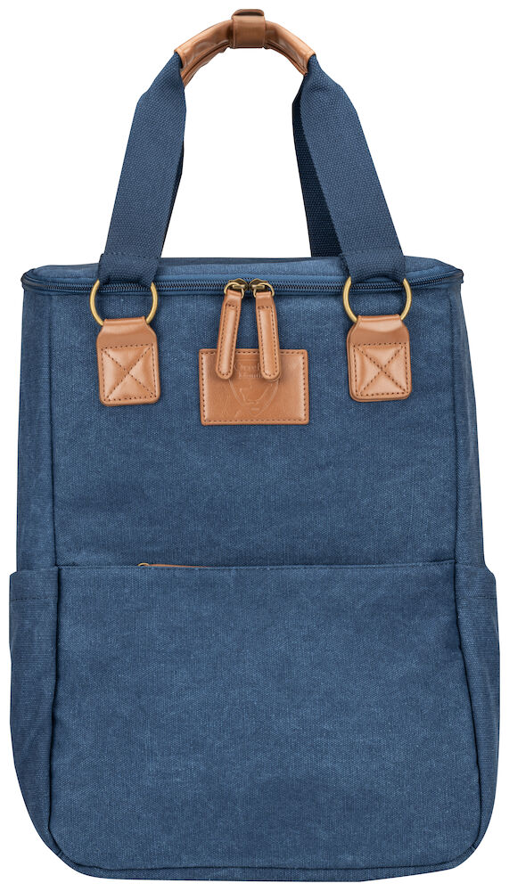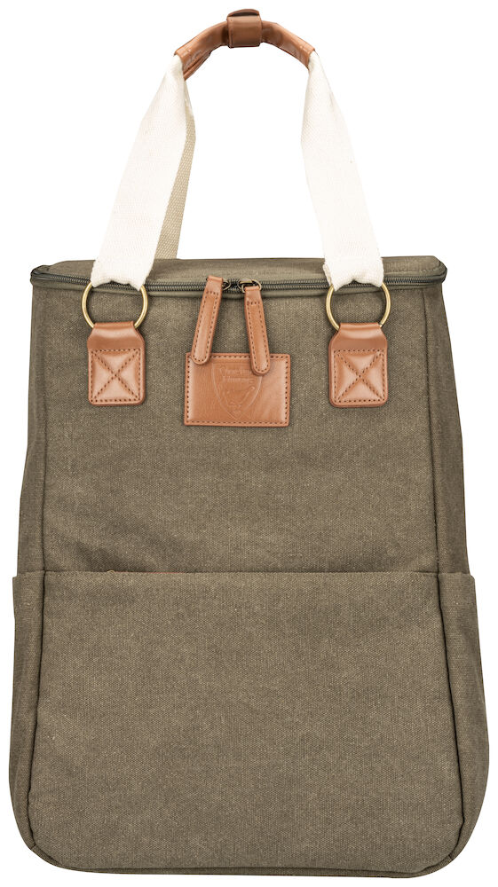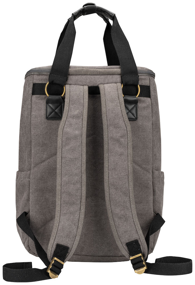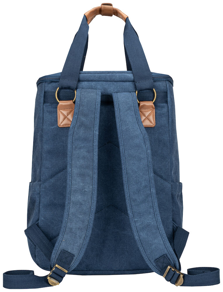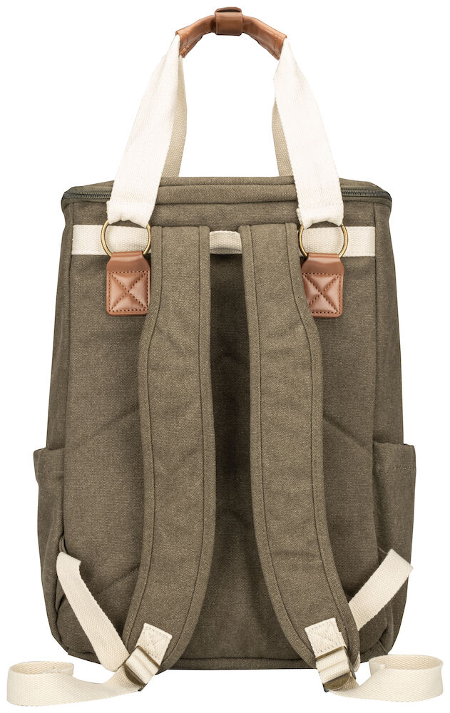 Kjøleryggsekk i kraftig canvas. Stort hovedrom og tre mindre lommer. Ryggsekken har regulerbare remmer. Detaljer i PU-lær.