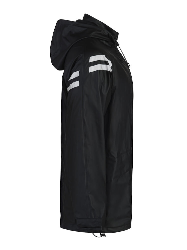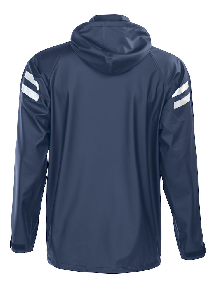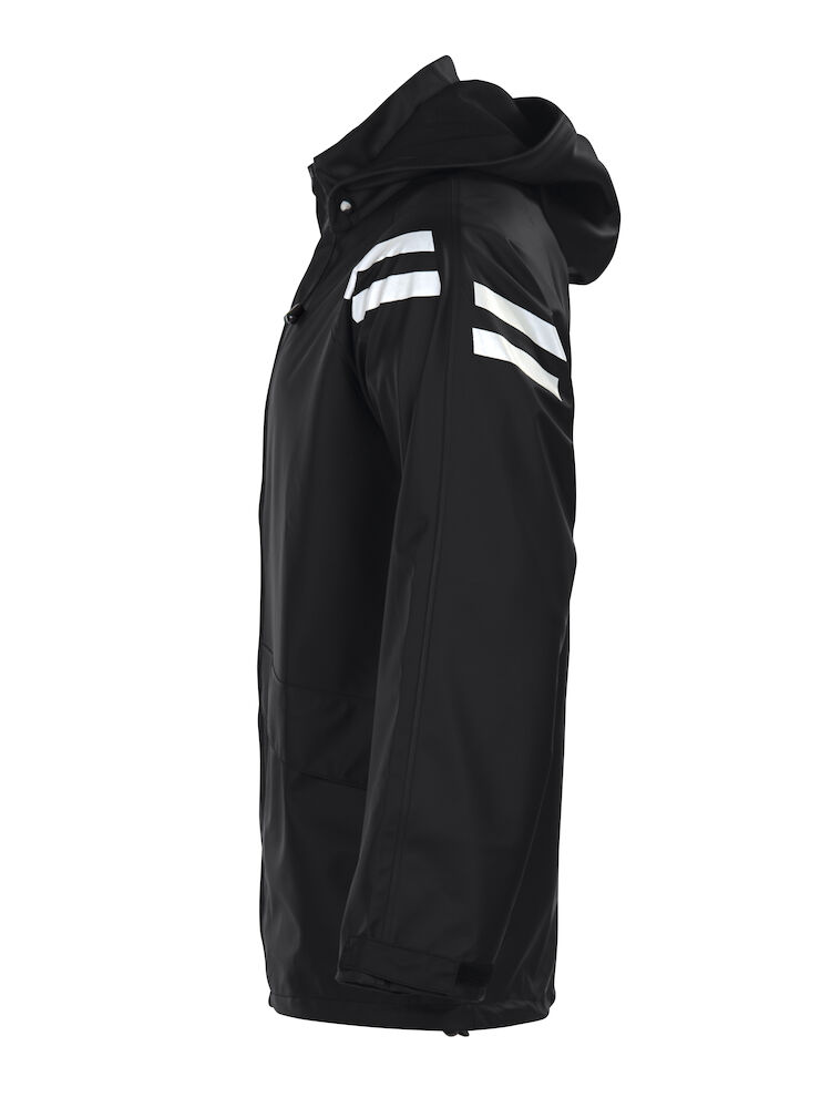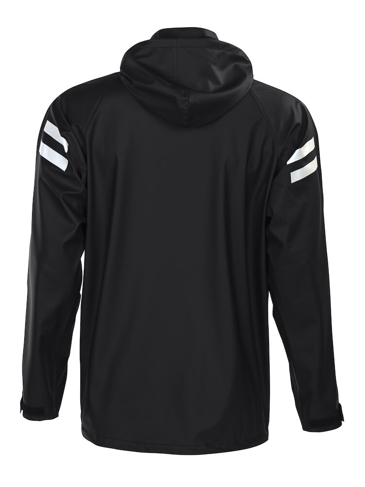 Trikotmaterialet er rive- og slitesterkt og har lang levetid. Stretchfunksjonen gir stor bevegelsesfrihet. Sydde og sveisede sømmer. Det myke materialet beholder bevegeligheten også når det er kaldt. Sertifisert ifølge EU-standarden EN343, noe som innebærer at det er godkjent ifølge EUs regler for regntøy. Avtagbar hette med trykknapper. Ermekant med borrelås. Frontlommer med klaff. Justerbar snor i linningen nede. Refleks på skuldrene og i nakken. Buksen har strikk i midjen og lommeåpninger foran med klaff, noe som gjør det lett å komme til lommer på innsiden.Sertifisert ifølge EN 343 for regntøy.