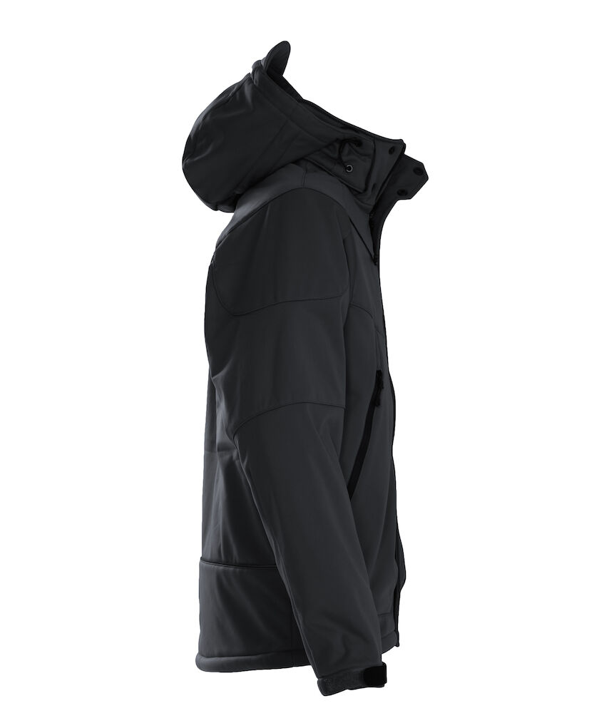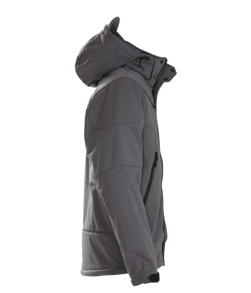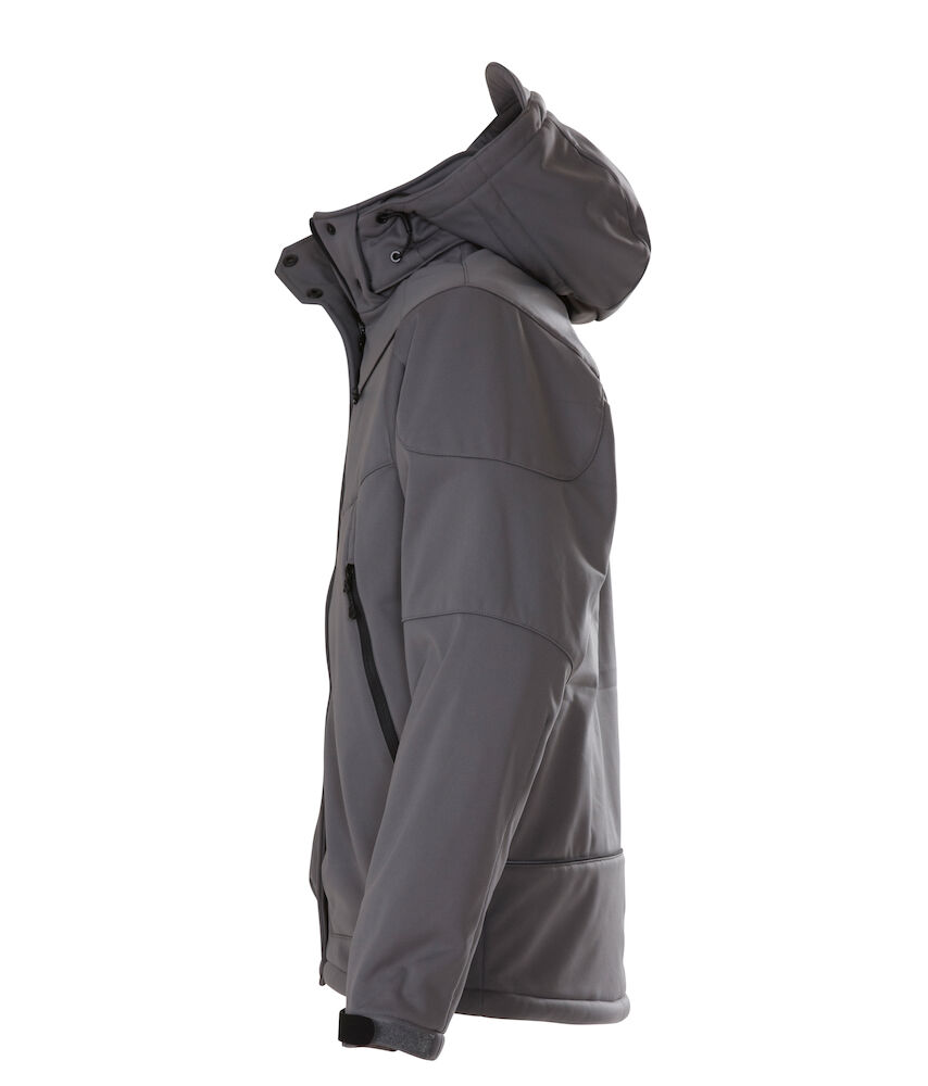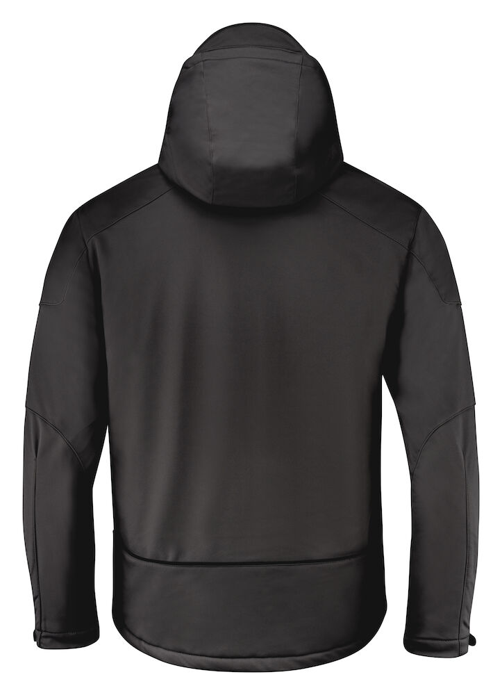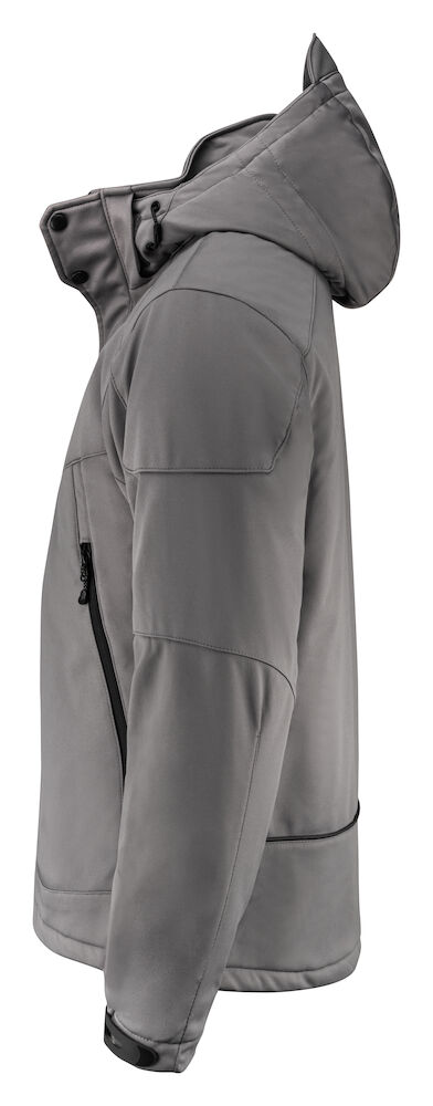Vattert softshell med avtagbar hette og formsydde ermer. Snorstramming i linning. Ermene kan justeres med borrelås. Lommer med glidelås i front, 2 innerlommer med glidelås, samt en innerlomme av mesh.