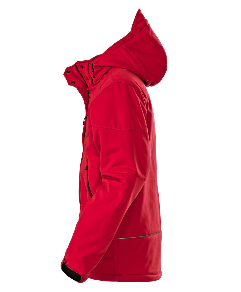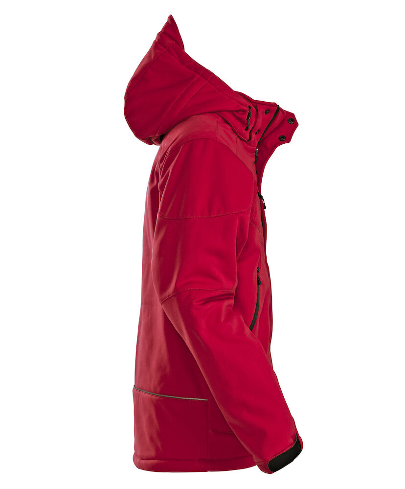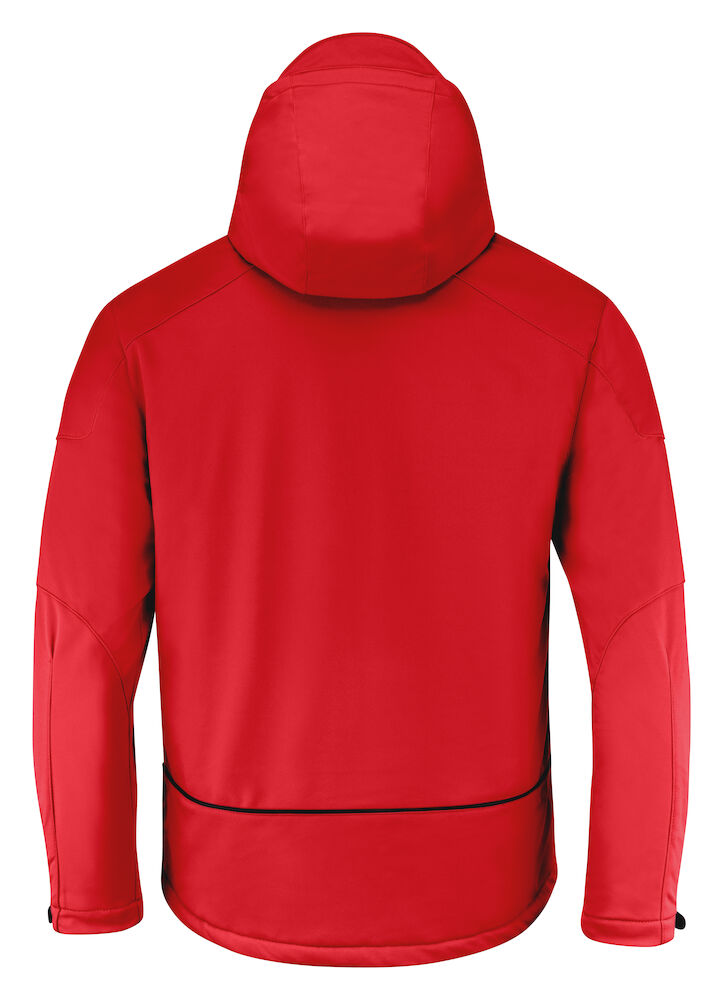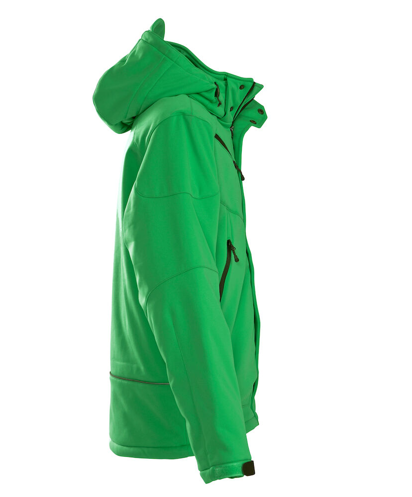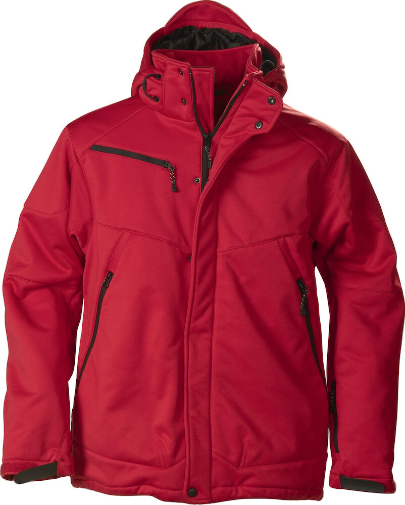 Vattert softshell med avtagbar hette og formsydde ermer. Snorstramming i linning. Ermene kan justeres med borrelås. Lommer med glidelås i front, 2 innerlommer med glidelås, samt en innerlomme av mesh.