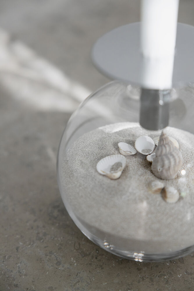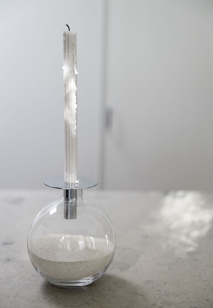 Top vase består av munnblåst glass og metall. En enkel men dekorativ interiørdetalj som fungerer like godt som vase til enkle snittblomster og som lysestake med ett kronelys. Metalldelen kan tas av.