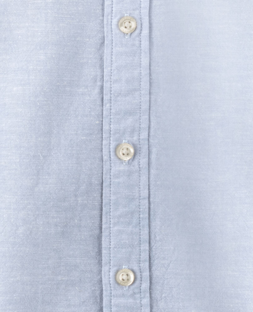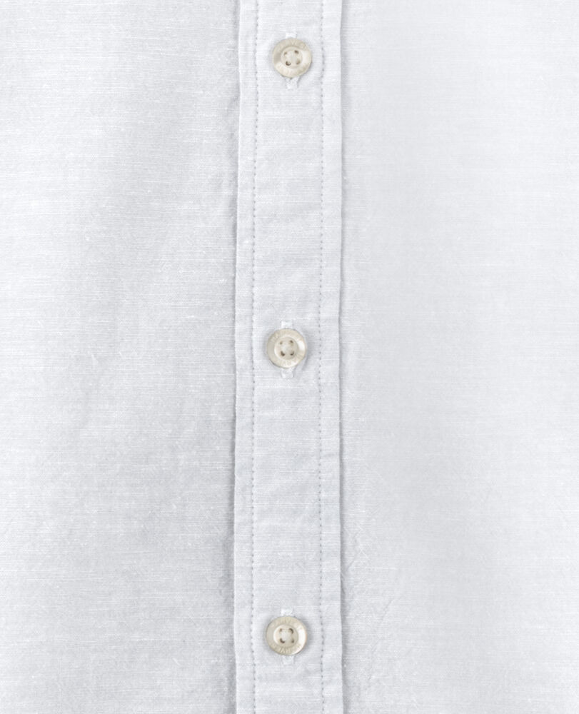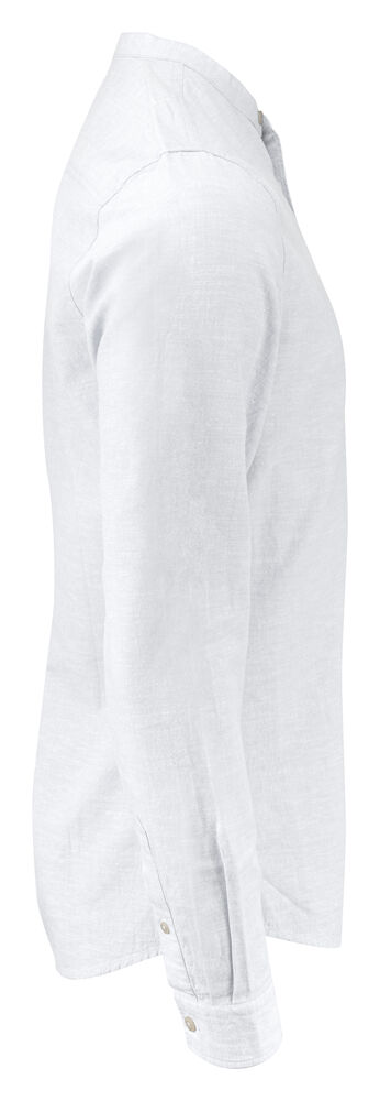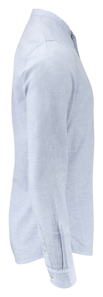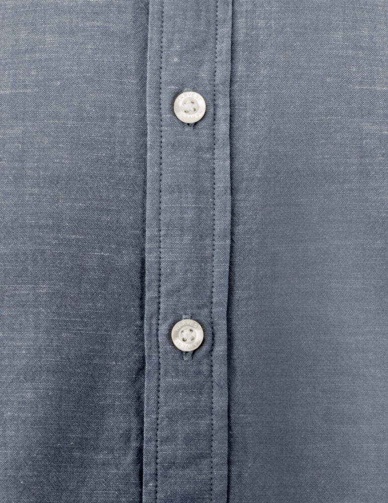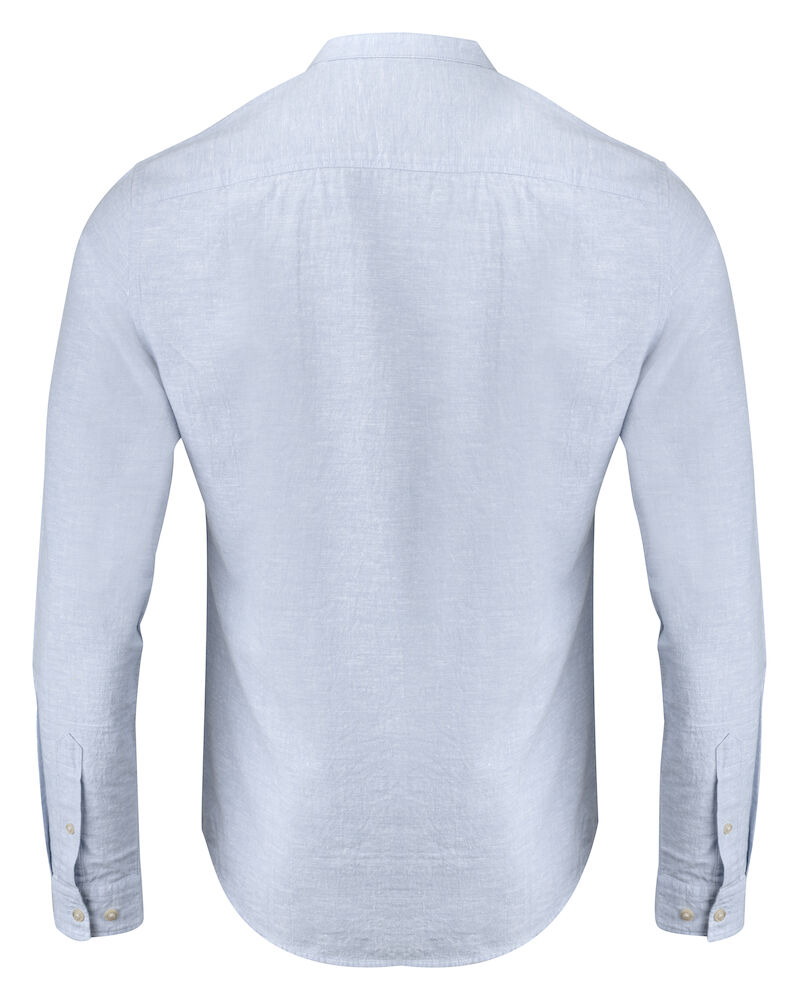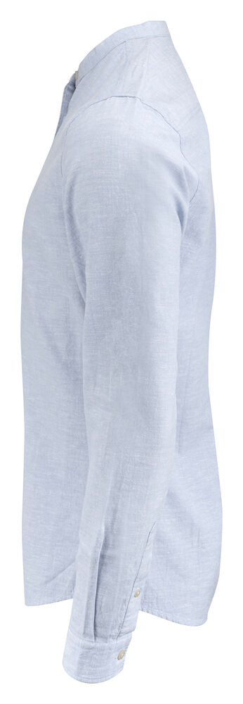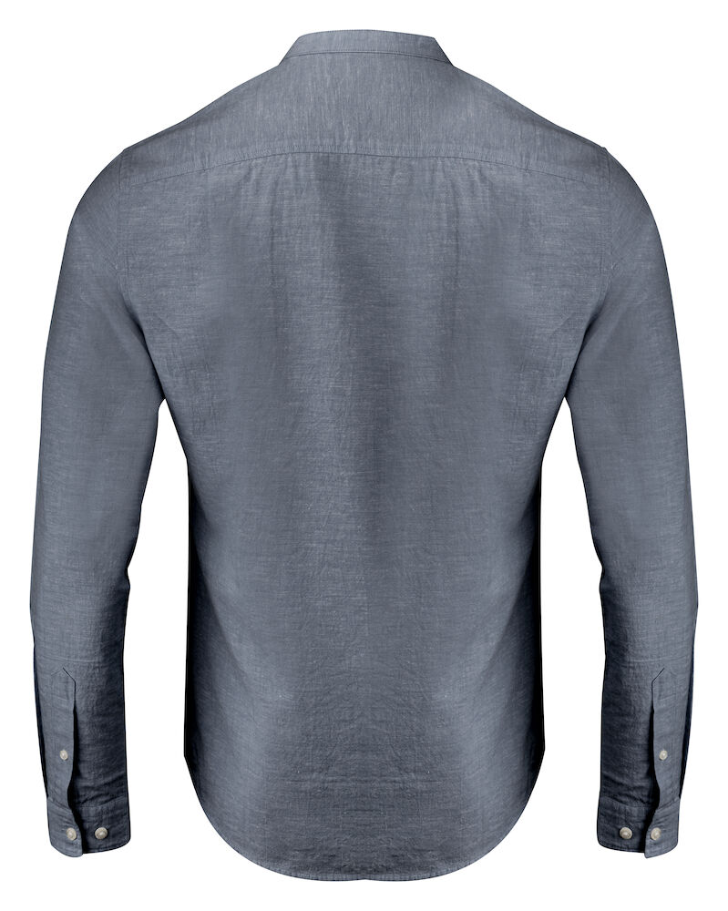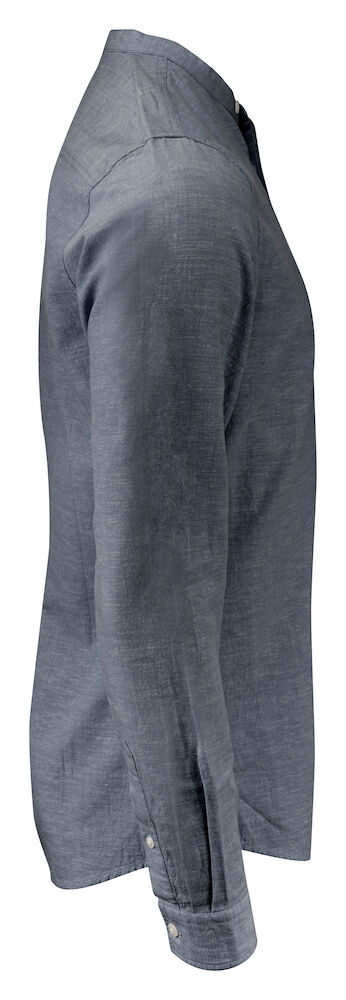 Krageløs skjorte laget av en blanding av bomull og lin. Skjorten har justerbare mansjetter, og er kontrastfarget på innsiden av bærestykket og mansjettene. Perlemor-knapper. Garnfarget.