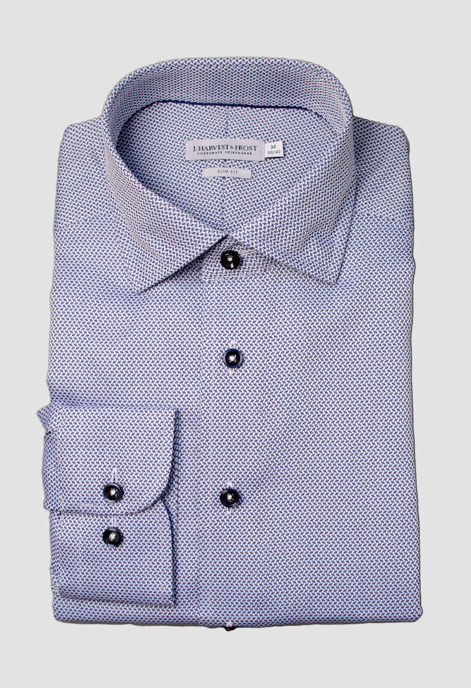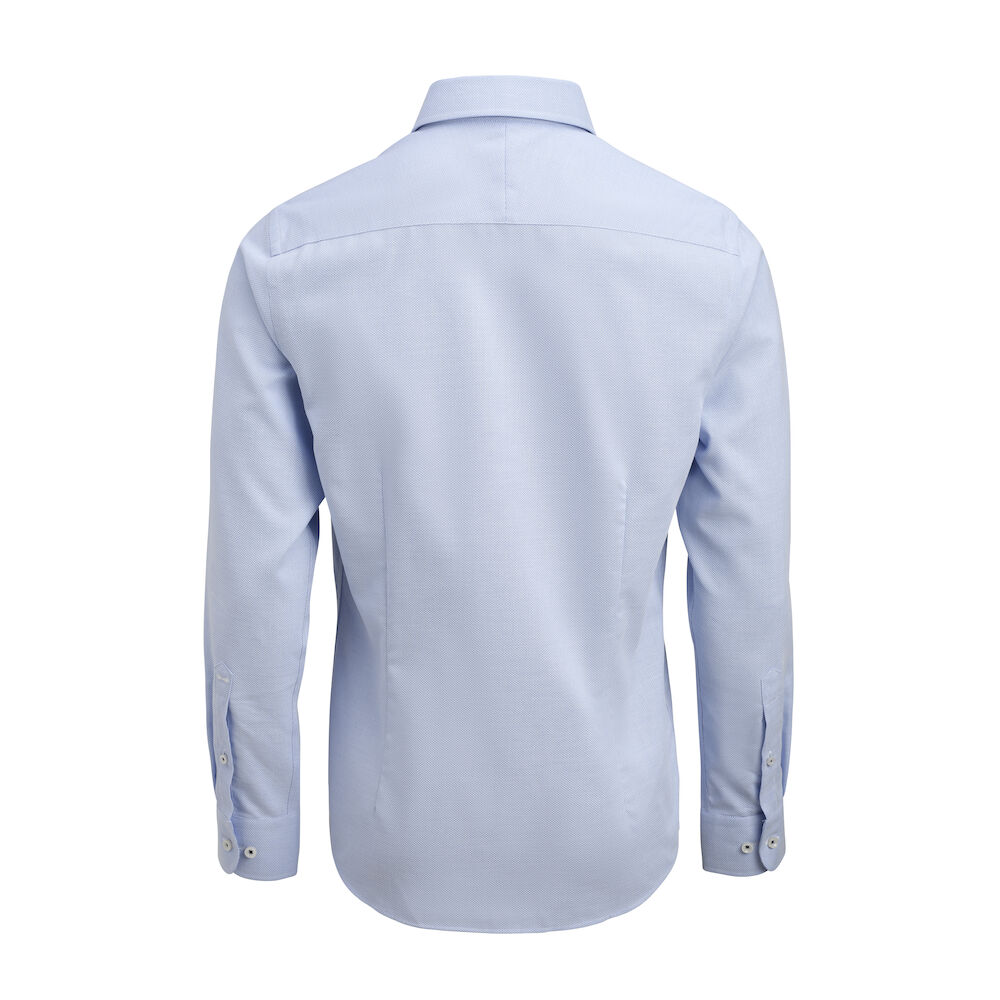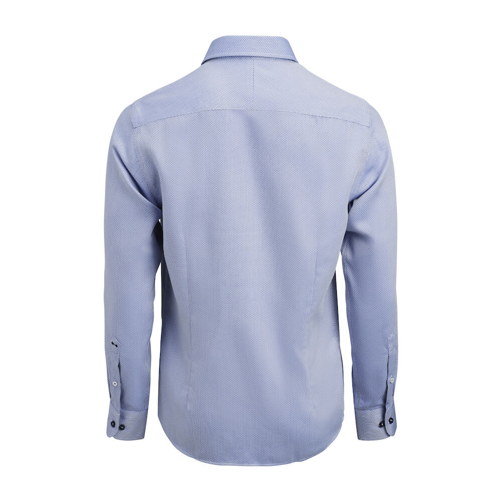 En mikromønstret skjorte i jacquard-veving, laget av en blanding av økologisk bomull og resirkulert polyester. Skjorten har skjult button down-krage og diskrete detaljer som kontrastfarget tråd på knappene og kontraststripe i knappestolpen. En subtil dobbystruktur, kombinert med en myk krage og mansjetter, gir skjorten et smart og moderne utseende. Skjorten er også easy-care behandlet.